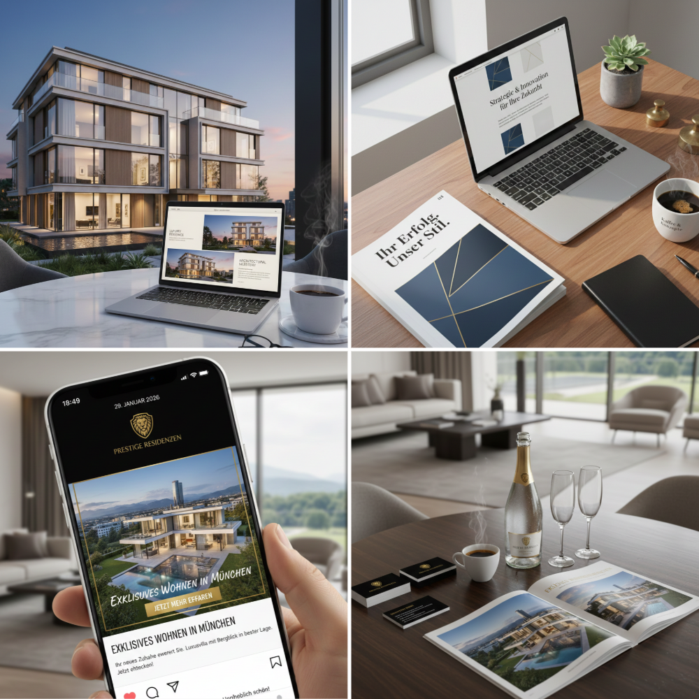 Präsenz: Google Business Optimierung und hochwertige Print-Materialien für Besichtigungstermine.